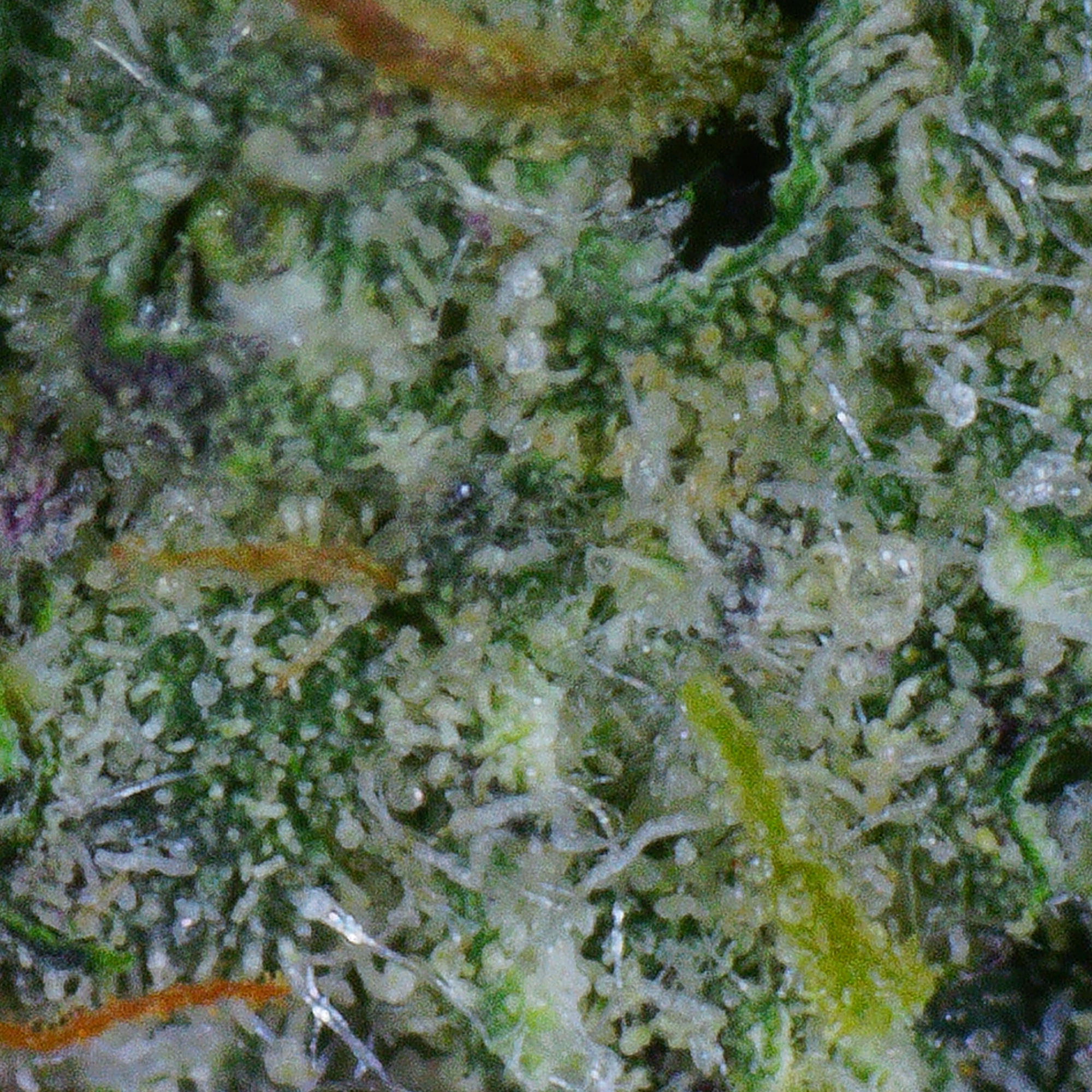 This bud has oversized and fat conical forest green nugs with thick orange hairs and tiny, bright white crystal trichomes.